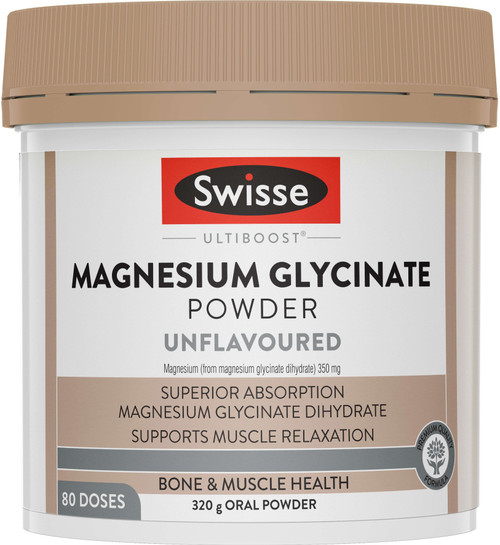 Magnesium plays a vital role in supporting healthy muscle function, including muscle relaxation, healthy muscle contraction, and helps relieve mild muscle spasms when dietary intake is inadequate. Delivering a bioavailable form of magnesium (glycinate dihydrate) in a convenient unflavoured powder, Swisse Ultiboost Magnesium Glycinate is perfect for mixing into your daily routine.